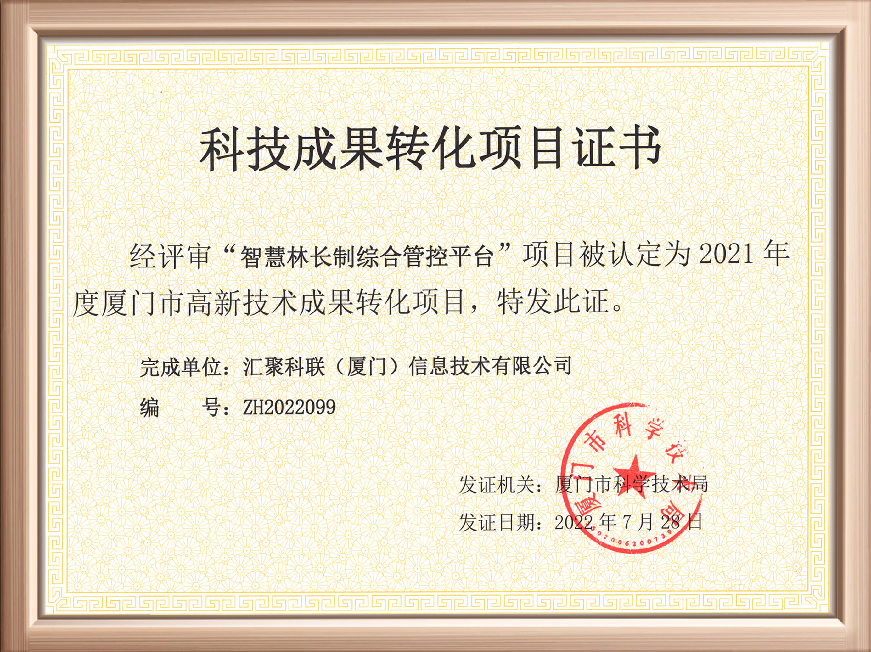 近日,匯聚科聯(lián)收到廈門市科技局頒發(fā)的“科技成果轉(zhuǎn)化項目證書”,公司“智慧林長制綜合管控平臺”經(jīng)過評選,成功被認(rèn)定為2021年度廈門市高新技術(shù)成果轉(zhuǎn)化項目。